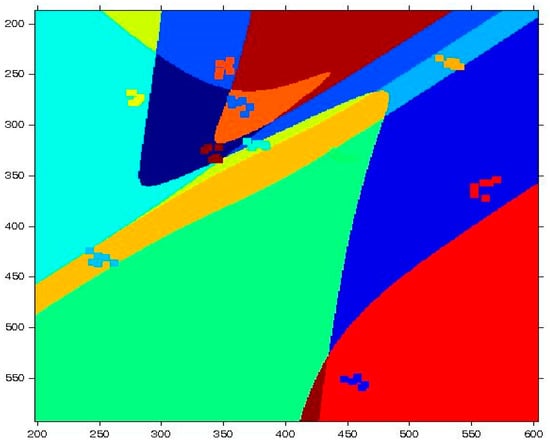 Figure 10 depicts the way these populations have been separated using a neural structure of two layers with three and four perceptrons, respectively. Obviously, the linear subspaces that separate the populations are curved according to the cluster’s shape.