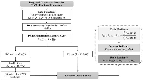 To overcome this gap, the aim of this paper is to propose a new integrated data-driven predictive resilience framework that incorporates traffic uncertainty factors to assess traffic resilience during disaster evacuation. The research objective is to utilize machine learning approaches and spatiotemporal data sources, specifically an augmented LSTM-based approach, to predict traffic conditions and map them to traffic resilience levels, demonstrating the effectiveness of the proposed framework through a case study of Hurricane Irma’s evacuation traffic.