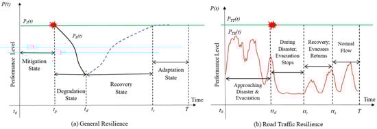 The resilience curve visually captures the dynamic behavior of the system’s performance over time, highlighting the initial decline, the subsequent recovery process, and ultimately, the restoration of normal performance. On the contrary, the road traffic performance PTR(t) degrades (volume increases) long before the disaster occurs at time ttd. As the evacuation process is in place following the disaster risk forecast to ensure the safety of the evacuees, a sudden increase in traffic volume is observed, causing congestion as a result of the road disturbance. The traffic volume decreases when a disaster is in progress because it is often not safe to travel when the hazard occurs. After the disaster period ends at time ttr, the traffic flow further restores the normal trend as the evacuees start returning at time tts.