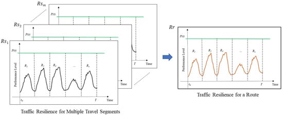 The traffic resilience follows an upside-down general resilience curve in Figure 3a. Thus, the current traffic performance PTR(t) can be calculated as the maximum volume-to-capacity ratio minus the loss of service of a roadway, which is defined as the V(t)/C(t) ratio, as shown in Equation (11). The value of 1 refers to the maximum volume-to-capacity ratio. The resilience of a given travel segment Rsm over a given timespan of a route can be calculated by combining all the daily resilience values of that particular segment, as illustrated in Figure 4. Thus, the travel segment resilience can be calculated as