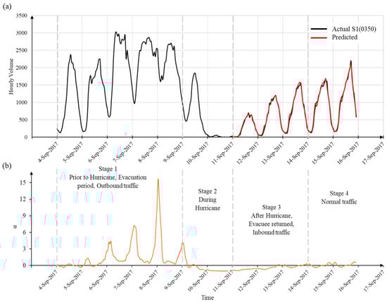 Prediction results for S1 (0350). (a) Actual data and prediction result of hourly volume; and (b) Change of α with time for S1(350) for S1(0350).
