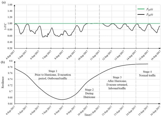 As mentioned in Section 2, the traffic performance shows a cyclic trend daily. The predicted traffic performances of all the segments PTR(t) were obtained using Equation (5), and the resilience curve for S1(0305) is shown in Figure 7a. The lowest traffic performances PTR(t) are observed over the pre-storm evacuation period of 4–9 September 2017. The traffic performance increased close to the targeted performance PTT(t), as there were hardly any vehicles during the hurricane. PTR(t) again reduced as the evacuees returned to their homes post-hurricane, before the traffic flow became normal at the final stage. The change in average traffic resilience along the US I-75 route is shown in Figure 7b, which mimics the general four-stage resilience curve in Figure 3a. These results can be further interpreted to mean that within the study period of 4–15 September 2017, the traffic infrastructures along US I-75 can be deemed resilient against traffic evacuation disturbances caused by Hurricane Irma.