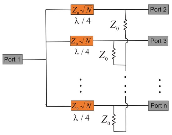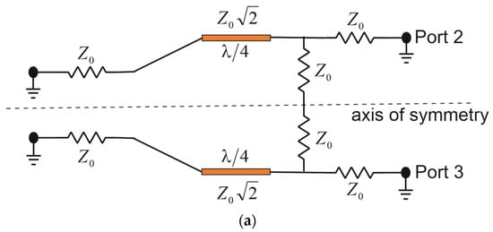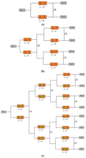 Equivalent circuit models for conventional 2-, 4-, and 8-way cascaded WPDs are illustrated in Figure 4a–c, respectively. As can be seen from Figure 4, conventional 2-way WPDs comprise 2 quarter-wavelength transmission lines with the characteristic impedances of . The same transmission line length and impedance values are also valid for 4- and 8-way WPDs, as depicted in Figure 4b,c. In order to obtain high isolation between the output ports, an isolation resistor of is connected between 2 output ports. In addition, the input/output ports must have characteristic impedances of for good impedance matching [28].