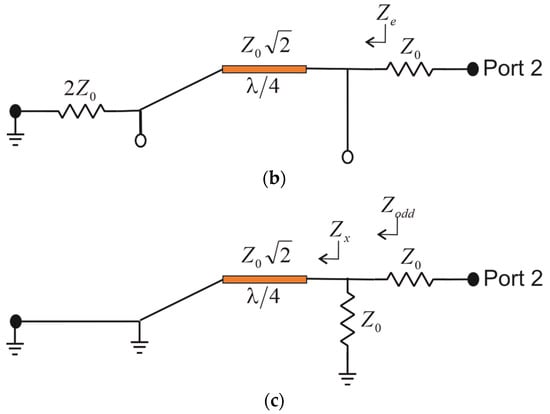 For equal power splitting, S21 and S31 can be obtained from S11. Furthermore, the isolation between the output ports can be calculated by using even–odd mode analysis. For this purpose, the even- and odd-mode half-circuits can be obtained by locating the magnetic and electric walls, respectively, on the symmetry axis shown in Figure 2a. Figure 2b,c illustrate the even- and odd-mode half-circuit models, respectively. It should be noted that the isolation resistor can be neglected for the even-mode circuit since the symmetry axis is open-circuited. In addition, the isolation resistor is Z0 for the odd-mode circuit due to the short-circuited symmetry axis. The isolation between the output ports, S32, can be found by deriving the even-mode and odd-mode input impedances. Here, the circuit model shown in Figure 1a should be considered a 2-port network, with the input port as port 2 and the output port as port 3. Thus, under the even- and odd-mode excitations, the input impedance seen from port 2 or 3 will be the even- and odd-mode input impedances, so that the isolation can be expressed as