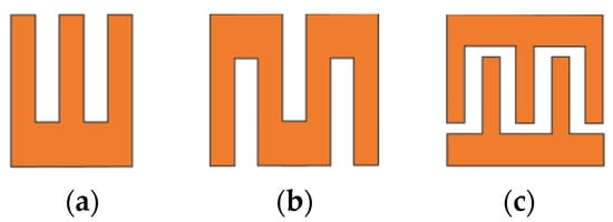 In order to reduce the overall circuit size, quarter-wavelength transmission lines can be capacitively or inductively loaded by different approaches, as shown in Figure 5. Due to the increase in the capacitance or inductance per unit length of the transmission line, the phase velocity on it decreases, so such a transmission line can be called a slow-wave structure. Among the slow-wave structures shown in Figure 5, slit-loaded and meandered transmission lines are widely preferred for different kinds of microwave circuits because of their easy fabrication processes. However, the fabrication of interdigital capacitor-loaded transmission lines are more difficult than the others since they may need extra via connections. The number of narrow slits and meandered sections can be determined with respect to the desired center frequency. Here, it should be taken into consideration that a transmission line with narrow slits and meandered sections should exhibit similar behavior to a quarter-wavelength transmission line having the characteristic impedance of . Thus, the designed WPD would have optimum performance in terms of return loss and isolation. For this purpose, all dimensions and the number of narrow slits and meandered sections were determined by using the parameter sweep in Sonnet Software. Investigations into the related parameters are described in the following sections.