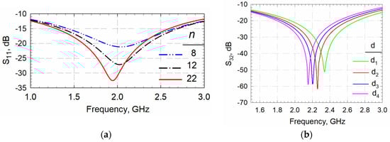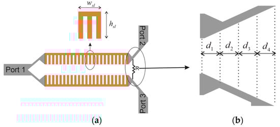A 2-way WPD was constructed by loading narrow slits as shown in Figure 6 [28]. An RT/Duroid substrate with a relative dielectric constant of 10.2 and a thickness of 1.27 mm was used in all design processes. The number of slits and the location of the isolation resistor affect the frequency response as depicted in Figure 7a,b, respectively. It is clear that the center frequency decreases as the number of narrow slits increases. Therefore, a very compact size can be achieved by using the maximum number of slits. Since 50-ohm port impedances were utilized, the isolation resistor was chosen as 100 ohm.