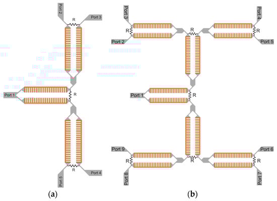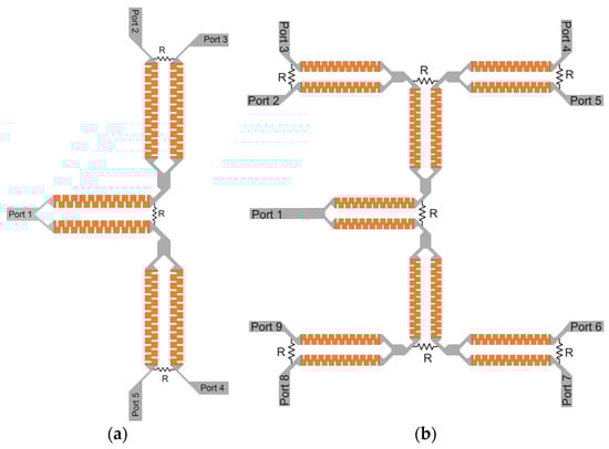 Conventional WPDs with meandered transmission lines: (a) 4-way; (b) 8-way.
