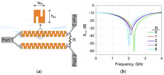 In a similar manner to the slit-loaded transmission lines, meandered sections can also be used for size reduction. Figure 10a illustrates a 2-way cascaded WPD constructed by meandered transmission lines. An RT/Duroid substrate with a relative dielectric constant of 10.2 and a thickness of 1.27 mm was used in all design processes. Effects of the number of meandered sections on the frequency response are depicted in Figure 10b. Here, the number of meandered sections is changed, starting from the middle of the transmission line. Depending on the proposed approach, a size reduction of 20.14% can be achieved.