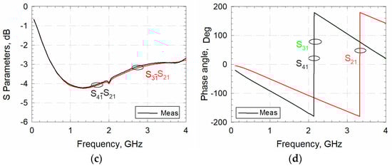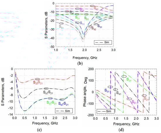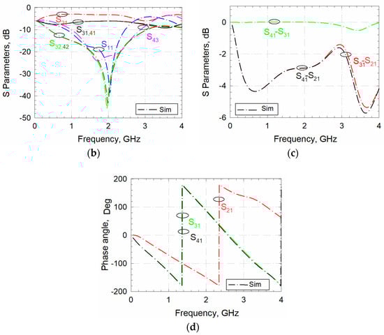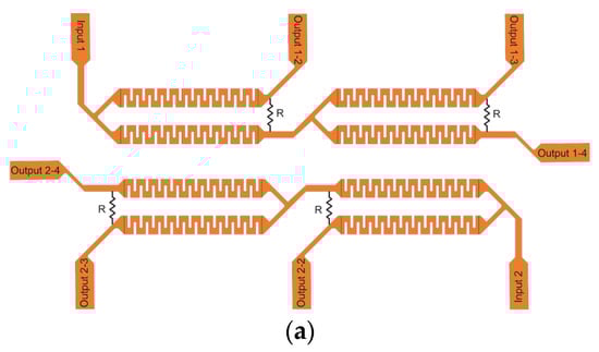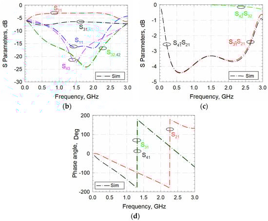 Figure 12 illustrates the circuit for two three-way WPDs located at the same side of the board. As can be seen from Figure 12a, there are two input ports located at the upper left and bottom right. The upper output ports belong to the upper circuit, whereas the bottom output ports are for the bottom circuit. Both these WPDs perform the same operations in different paths, so the proposed arrangement actually behaves like a power-divider bank to be used for a multi-input—multi-output (MIMO) system. They are useful for different antenna arrays serving different operations. Moreover, the input power is halved at output port 2, while the power at output ports 3 and 4 is equal. The simulated frequency responses are demonstrated in Figure 12b. The magnitude and phase differences are also shown in Figure 12c,d, respectively.