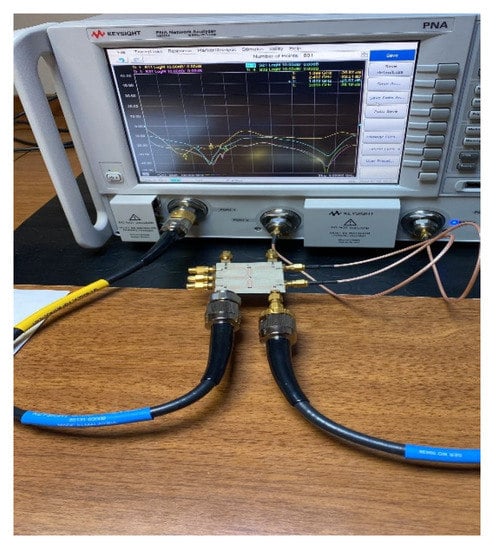 First, experimental studies of the power dividers having narrow-slit-loaded transmission lines introduced in [28] are presented. Photographs of the manufactured N-way WPDs having narrow slits in [28] are shown in Figure 15. Figure 16 illustrates a measurement view, where 50-ohm loads were used to match the idle output ports for 4- and 8-way power dividers since the measurement device has only four ports. The measured results of the power dividers having narrow-slit-loaded transmission lines were compared with the simulated results in Figure 17 [28]. It is obvious that the measured and simulated results are in very good agreement. In Figure 17a, the center frequency was 2 GHz at the 15 dB fractional bandwidth (FBW) of 36.26%. As can be seen from the figure, the return loss and isolation level were better than 15 and 20 dB within the FBW, respectively. Within the FBW, the minimum isolation level and insertion loss were approximately 29.56 dB at 2 GHz and 3.29 dB, respectively. The measured and simulated results of the 4-way WPD are illustrated in Figure 17b, with the return loss and isolation level of better than 15 and 20 dB, respectively. The center frequency was 1.8 GHz at the FBW of 94.44%, and the insertion loss was better than 3 + 0.5 dB. Moreover, the center frequency of the 8-way WPD was measured at 1.9 GHz at the FBW of 81.05%. The measured results were compared with the simulated ones in Figure 17c, where the insertion loss, return loss, and isolation level obtained were better than 9 + 0.5, 15, and 20 dB, respectively.