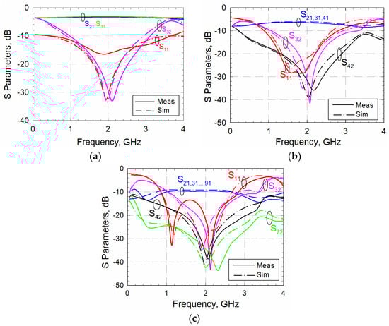 Comparison of the measured and simulated results of the WPDs having narrow-slit-loaded transmission lines for a (a) 2-way WPD; (b) 4-way WPD; and (c) 8-way WPD.