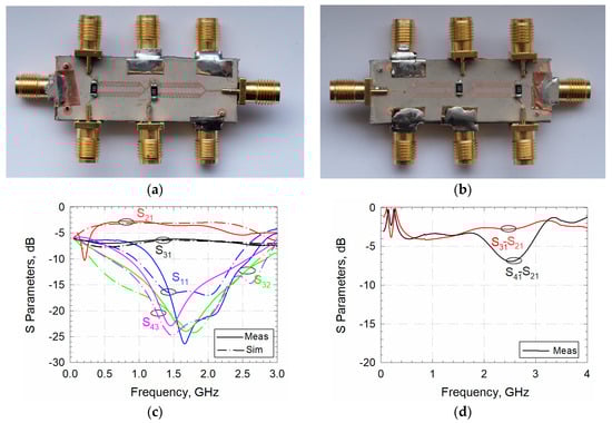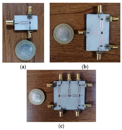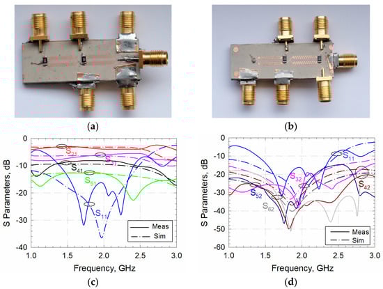 Meandered-transmission-line-based WPDs with alternative input/output port configurations were manufactured and tested for demonstration. A photograph of the two fabricated three-way WPDs is shown in Figure 22a. The frequency response of the designed power divider is depicted in Figure 22b. As can be seen from the figure, the designed circuit can serve within the frequency band of 1.5–2.0 GHz. Within this frequency region, the isolation level between the output ports is better than 19.96 dB, the return loss is better than 17.71 dB, and the insertion loss is better than 3 + 0.5 dB. Figure 22c shows the magnitude differences, which are better than 4.4 dB. The phase responses corresponding to the S-parameters are also illustrated in Figure 22d.