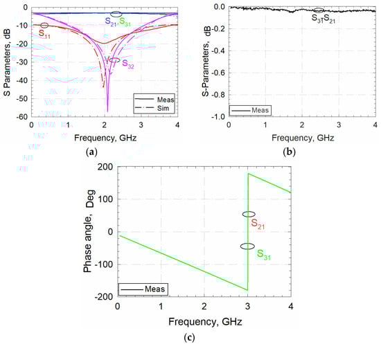 (a) Comparison of the measured and simulated results of the WPDs having meandered transmission lines for a 2-way WPD; (b) magnitude differences of S-parameters for a 2-way WPD; and (c) phase responses.