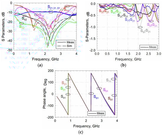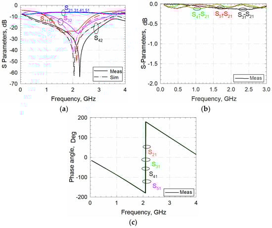 (a) Comparison of the measured and simulated results of the WPDs having meandered transmission lines for a 4-way WPD; (b) magnitude differences of S-parameters for a 4-way WPD; and (c) phase responses.