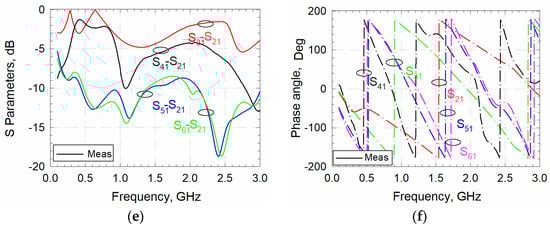A meandered-transmission-line-based multilayer five-way WPD was manufactured and successfully tested. Photographs of the front and back views of the fabricated circuits are shown in Figure 24a,b, respectively. The measured and simulated return and insertion losses of the proposed five-way power divider are compared in Figure 24c, with an acceptable agreement. The measured and simulated isolation levels between the output ports are also depicted in Figure 24d. It is clear that the proposed multilayer 5-way WPD can be used for different communication systems. Within the frequency band of 1.5–2 GHz, the return loss, insertion loss, and isolation levels are better than 16.52, 3 + 0.5, and 14.47 dB, respectively. The differences between the measured and simulated responses resulted from the fabrication errors and especially from the layer-combining process. Magnitude differences between the insertion losses and the phase responses are shown in Figure 24e,f, respectively.