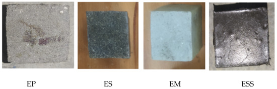 Sample shapes of epoxy PVC waste (EP), epoxy sand (ES), epoxy marble dust (EM), and epoxy steel slag (ESS) for compressive strength.