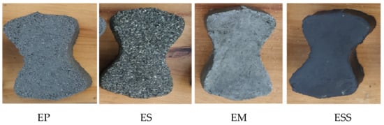Sample shapes of epoxy PVC waste (EP), epoxy sand (ES), epoxy marble dust (EM), and epoxy steel slag (ESS) for tensile strength.
