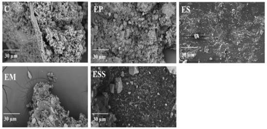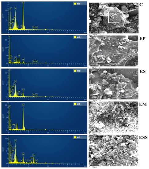 Figure 10 shows the results of SEM-EDX analysis of C, EP, ES, EM, and ESS on the 28th day at different areas of the micrograph. The rough surface is due to epoxy resin, and the EDX shows the presence of carbon and oxygen at 0.277 and 0.523 keV, which are the main elements with higher content at the same level for all regions. The existence of carbon and oxygen can be mainly related to epoxy resin [55,56]. Moreover, the elemental composition found in EDX analysis of ESS, ES, C, EM, and EP is presented in Table 3.