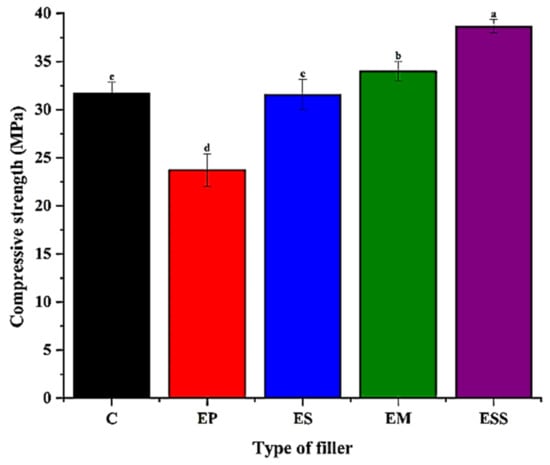 Compressive strength of cement mortar (C), epoxy PVC waste (EP), epoxy sand (ES), epoxy marble dust (EM), and epoxy steel slag (ESS). Data represents mean ± standard deviation (indicated by vertical error bars), n = 3. Values with the different superscript letter (a, b, c, and d) are significantly different (p < 0.05).