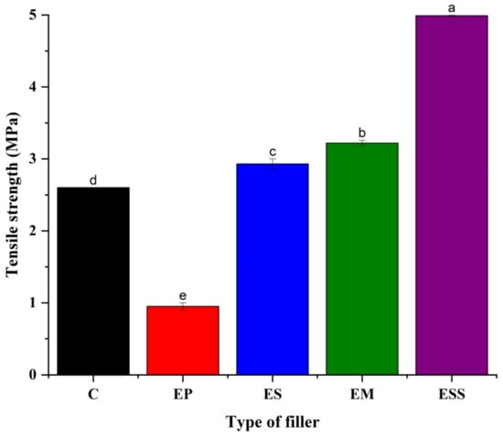 Tensile strength of cement mortar (C), epoxy PVC waste (EP), epoxy sand (ES), epoxy marble dust (EM), and epoxy steel slag (ESS). Data represents mean ± standard deviation (indicated by vertical error bars), n = 3. Values with the different superscript letter (a, b, c, d, and e) are significantly different (p < 0.05).