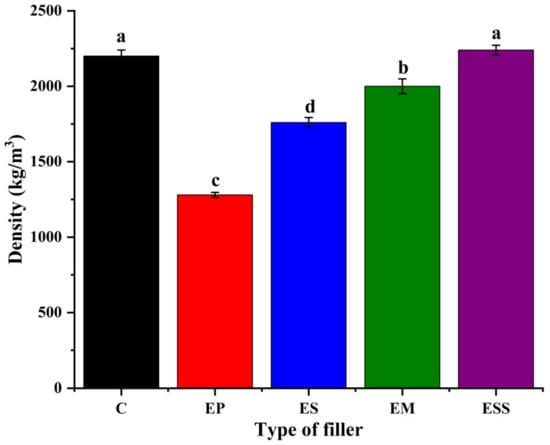 Density of cement mortar (C), epoxy PVC waste (EP), epoxy sand (ES), epoxy marble dust (EM), and epoxy steel slag (ESS). Data represents mean ± standard deviation (indicated by vertical error bars), n = 3. Values with the different superscript letter (a, b, c, and d) are significantly different (p < 0.05).