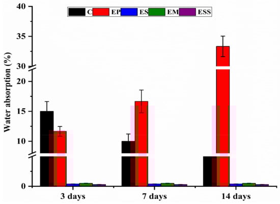 The durability of epoxy mortar is greatly influenced by water absorption. The important parameters that influence water absorption are the size and texture of the fillers. Porous fillers tend to have a higher water absorption, while the other waste fillers, i.e., steel slag, marble dust, and sand, fill the cavities in the epoxy mortar, leading to a reduction in water absorption. Figure 7 shows the water absorption of epoxy mortars for 3, 7, and 14 days. It can be noticed that the typical water absorption of the epoxy steel slag (ESS) is 0.03%, epoxy marble dust (EM) is 0.05%, and epoxy sand is 0.042%. The cement mortar (C) water absorption capacity decreases with respect to time. The water absorption value is mainly influenced by various factors including the type of cement, the curing standards, and the surrounding environment [37,38]. The content of water absorption is very low in these epoxy mortars because the epoxy resin is a waterproofing material [16]. Water absorption in epoxy PVC (EP) waste mortar was greater than that in epoxy resin because due to the existence of pores in the epoxy PVC mortar. It has been observed that air voids in PVC mortar could be linked to hollow infill particles [39]. The existence of air cavities is due to the porous nature of EP which increases water absorption. Figure 7 shows the water absorption of epoxy PVC mortars was 11% for 3 days, 16% for 7 days, and 33% for 14 days. From these results, it is observed the water absorption in epoxy PVC mortar increased due to an increase in exposure to water duration.