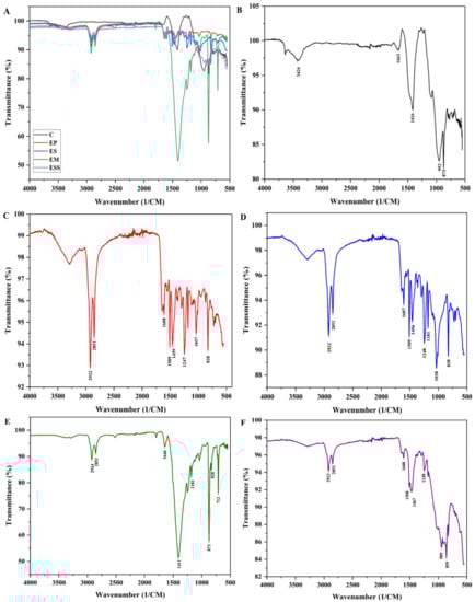 Figure 8 and Table 2 show the FTIR analysis of C, EP, ES, EM, and ESS. Figure 8A shows the combined analysis of all materials. Figure 8B shows that the characteristic peak intensity of C is the highest in the C3S and C2S groups at 873 cm−1, compared to C3A with a peak of 1416 cm−1. Moreover, the band for the portlandite was available at 3426 cm−1. The chemical functional groups observed in C3S and C2S contain compounds Si-O-Si and Ca-O-Si, while C3A and portlandite contain Al-O, Ca-O-Al, and Ca-O, O-H [40]. The band regarding the I.R. spectrum of EP is seen in Figure 8C briefly at 840 cm−1 and is assigned to C-Cl stretching vibration; however, C=O stretching vibration occurs at 1650 to 1720 cm−1. On the other hand, the appearance of the band at around 1247 cm−1 indicates the rocking of the C-H bonds in the molecule [41]. The quartz peaks corresponding to the stretching vibrations of the Si-O bonds in the ES are typically observed in the region of 1000–1200 cm−1 (Figure 8D) [42]. However, quartz is hard and can provide additional strength and durability to the ES. In addition, C-H aromatic rings corresponding to a peak at 828 cm−1 for EM, EP, and ES are identical [43]. Figure 8E shows C-H symmetric and asymmetric deformation corresponding to peaks at 1181 cm−1; at the same time, the peaks at 1411 cm−1 are due to Si-O and Ca-O stretching in the EM [44]. It is determined that specific peaks in the FTIR spectrum correlated with improved strength and durability. For ESS, the antisymmetric absorption vibration peaks of Si-O groups appear at 989 cm−1. These groups are due to the C2S and C3S phases present in the ESS (Figure 8F) [45]. The antisymmetric absorption vibration peaks of the Fe-O group appear at 859 cm−1 [46]. Si-O and Fe-O bonds in the FTIR spectrum improve the strength, toughness, and bonding between the epoxy matrix and the steel slag filler. The transmittance bands at 1608 and 1508 cm−1 are due to the C–C bond of the aromatic ring. The band at 2922 cm−1 in the FTIR spectrum is due to asymmetric and symmetric stretching interactions of the methyl and methanol [47].