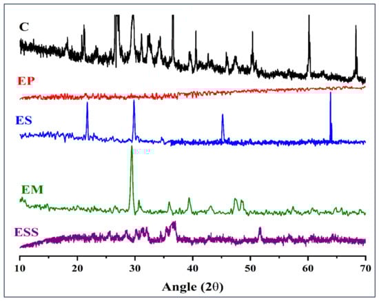 In the EDX micrograph of C in Figure 10, it has been noted that aluminum (Al), silicon (Si), and Ca have concentrations of 1.45, 1.66, and 3.55 keV [57]. Similarly, EP has chlorine (Cl) and Ca concentrations at 2.65 and 3.65 keV on the EDX micrograph. Moreover, the EDX micrograph of ES shows the presence of Si, Ca, and iron (Fe) at 1.740, 2.622, and 6.403 keV [58,59]. The EDX micrograph of EM exhibits Mg and Ca content at 1.486 and 3.691 keV, respectively [44,60]. Additionally, the EDX micrograph of ESS shows the presence of Si, Ca, and Fe at 1.55, 3.55, and 6.5 keV [40,61,62]. It has been found that Ca, Mg, and other phases may be seen in the EDX of all five samples (C, EP, ES, EM, and ESS) in Figure 6. Based on the experimental results, it is concluded that mechanical strength (compressive and tensile strength) was increased and porosity was decreased (mechanical strength inversely proportional to porosity) due to the addition of different phases of Ca, Mg, and Fe in ESS and EM. These features enhanced the mechanical strength of the materials.