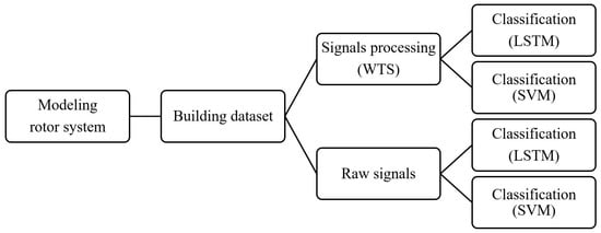The primary rationale behind the selection of LSTM and SVM for the classification phase stems from their distinct mechanisms in establishing relationships between independent and dependent variables. Specifically, LSTM has been engineered to discern temporal dependencies within sequential and time-series data, whereas SVM predominantly excels in identifying non-linear dependencies within the data set. Consequently, the observed outcomes ensuing from the application of these methodologies demonstrate that the employed feature extraction procedure, herein referred to as WTS (wavelet transform and statistical features), exhibits considerable efficacy in capturing dependencies in rotor systems signals, encompassing both temporal dynamics and non-linear characteristics. Figure 1 reveals the workflow of the present research.