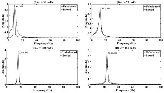 When the rotation pace was 75 and 100 rad/s, the vibration signals of the bowed and unbalanced systems were in the same range according to Figure 4. While in the slowest rotational speed, e.g., 50 rad/s, the vibration of the bowed system was more intensive than the unbalanced one; on the assumption of the fastest velocity (150 rad/s), on the contrary, the amplitude of the unbalanced system is much higher than the bowed rotor while the magnitude of the bowed systems remained approximately constant in all operational conditions. These behaviors find their roots in the unbalancing force’s nature, which is characterized by an increase in magnitude with the square of the rotational speed, as well as the shaft bow’s introduction of a roughly constant force [15,48]. Similar observations were noted in industrial scenarios, where the augmentation of rotational speed was found to be ineffectual in yielding a proportional increase in the resultant force of a shaft deflection [49].
