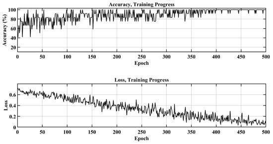 The confusion matrices in the training and testing steps are also represented by the graphs in Figure 7. Only 1 sample out of the 112 that were assigned to the training process is incorrectly classified in the validation, despite the testing accuracy being 100%.