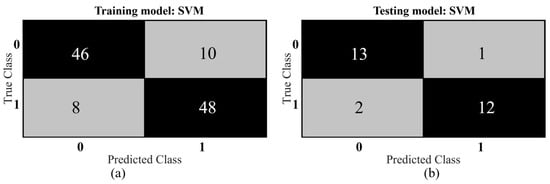 Figure 8. Confusion matrix using WTS and SVM: (a) training step and (b) testing step.