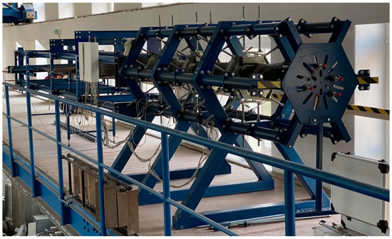 All the measurements of contact forces (CFs) on an idler housing’s rollers [26] were performed on a specially developed test stand [27], on which 3 hexagonal idler housings with a closed conveyor belt were placed. A view of the test stand is shown in Figure 1, and its basic features are listed in Table 1. The parameters of the used conveyor belt are listed in Table 2.