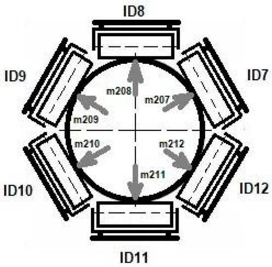 - Six measurement modes in which the model was filled with a material with a single roller always missing at different positions ID7 ÷ ID12 (designation m207, m208, m209, m210, m211, and m212, in terms of Figure 1);