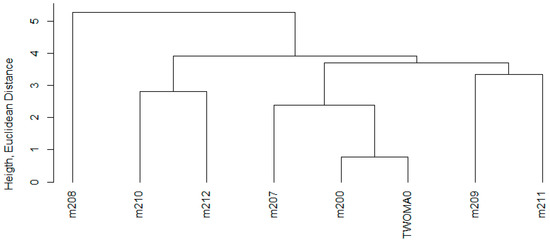 Each measurement was considered an object with attributes of the average values of contact forces (CFs) at all six positions of rollers ID7 ÷ ID12 (Figure 2). These values correspond to the difference in average values of contact forces (CFs). The smallest is the Euclidean distance of objects in the failure-free operation of the conveyor belt m200, and the operation of the conveyor belt without material TWOMA0. There is a minimum difference in Euclidian distance (0.78 N ÷ 3.72 N), highlighted in purple, during failure-free operation and a failure (second column in Table 3). Such a minor increase in contact forces (CFs) can occur at any time during the failure-free operation, and, therefore, the failure cannot be precisely identified from the given Euclidean distance. It is clear from the results that for precise failure identification, the measurement points of contact forces (CFs) need to be determined, at which the change in contact forces (CFs) for individual failures is significantly larger. The Euclidean distance values are also shown as a dendrogram in Figure 4. The graphic display makes it clear that a different method must be chosen to unambiguously identify failures.