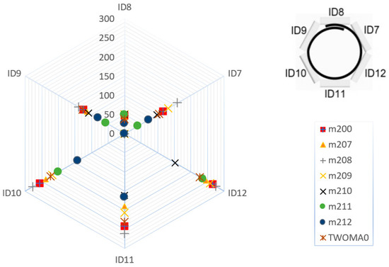 To display average values of the contact forces (CFs) for individual measurements, a simple radar graph was used, as shown in Figure 5, in which the average values are the contact forces (CFs) at roller positions ID7 ÷ ID12 shown in the grid. Each measurement is displayed as a series of data.