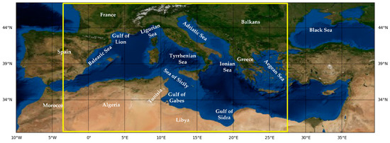 The DAEC of 16 to 18 June 2016, which is studied here, was identified using a satellite algorithm, based on key aerosol optical properties that are a measure of aerosol load, size, and absorptance. Specifically, the algorithm, which is described in detail in [39], uses level-3 daily 1° × 1° gridded spectral Aerosol Optical Depth (AOD) data from the Moderate Resolution Imaging Spectroradiometer (MODIS) Aqua Collection 6.1 and corresponding Aerosol Index (AI) data from the Ozone Monitoring Instrument (OMI) Aura OMAERUV databases. The algorithm, which ran over the broader MB for the study period 2005 to 2019 [39], operates on a daily basis and on a pixel level to first identify the presence of DAs over the specific pixel and on the specific day. The selected study region (broader MB extending from 9.5° W to 39.5° E and from 29.5° N to 47.5° N) is shown in Figure 1, where a smaller region (yellow frame), over which the 16–18 June 2016 dust export took place and regional averaging was applied to DRE values (see Section 3.5), is also displayed. The algorithm operates whenever the following specific criteria are met: (i) the Ångstrom Exponent (a), calculated using the original MODIS spectral AOD information, is less than 0.4 (α ≤ 0.4), and (ii) the AI is greater or equal to 1 (AI ≥ 1). In those cases, i.e., when dust dominates in the atmosphere overlying the specific pixel, another threshold is applied to ensure the occurrence of a strong or an extreme DA Episode (DAE), which is the case whenever AODmean + 2STDV ≤ AOD ≤ AODmean + 4STDV and AOD ≥ AODmean + 4STDV, respectively. Then, if at least 30 pixels undergo strong or extreme DAEs on a specific day, this day is considered to be a DAE Day (DAED). For each identified DAED, the algorithm outputs information about the pixel-level dust loading (AOD) and the number of DAEs. Three such DAEDs, on 16, 17, and 18 of June 2016, were identified by the satellite algorithm, yielding the investigated DAEC in this study. Note that the examined DAEC in this study is one of the 98 DAECs (with duration of n (n ≥ 1) sequential DAEDs) consisting of the 166 overall DAEDs identified by the algorithm from 2005 to 2019 [39]. This examined DAEC was selected because: (i) it took place in summer, when the cloud fraction (CF) over the MB, and especially over its southern parts, is low, while the incoming solar radiation is high; (ii) its 3-day duration enables the observation of the evolution of the dust export from North Africa in parallel with the evolution of cloudiness and temperature fields; and (iii) it has extended spatial coverage of the MB, covering 8% of its area. Thus, the selected DAEC, apart from being intense, is also long and spatially extended.