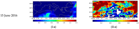 The geographical patterns of the atmospheric absorbed solar radiation (second column in Figure 3) are governed by clouds and aerosols as well as the available solar radiation. Most aerosols, except for strongly scattering ones such as sulfate and sea-salt, increase the SW atmospheric absorption. On the other hand, clouds strongly scatter the SW radiation, while modifying (increasing or decreasing) the absorbed solar radiation in the atmosphere through different mechanisms. For example, due to their high albedo, clouds increase the upward SW flux and thus the SW absorption by ozone and water vapor, or absorbing aerosols (e.g., dust or biomass burning) above them [76]. The SW absorption is also increased within the cloud layers, because they absorb more near-infrared (NIR) solar radiation than water vapor does [77]. On the contrary, clouds can reduce the SW atmospheric absorption by shielding the water vapor and consequently the solar absorption below them. The first two mechanisms dominate the third one in high clouds; in middle clouds, the three mechanisms nearly cancel out; while the third mechanism predominates in low clouds [75]. On the first day of the DAEC (16 June 2016, Figure 3ii-a), there is a clear contrast between the western and eastern MB, where aerosols and clouds practically do not exist (Figure 3 and Figure S8). The largest SW atmospheric absorption (400–450 W/m2) is observed over northeast Algeria, Tunisia, and Tunisian coasts, where DOD is also maximum (Figure 2). Secondarily high absorption is observed over an area along a northeasterly oriented axis, extending from the boundaries between Morocco and Algeria up to the northernmost part of the western Mediterranean Sea, where high-level clouds exist (Figure S8). The patterns of atmospheric solar absorption and their explanation are similar for the next two days of the DAEC, namely on 17 and 18 June 2016. As it concerns the patterns of absorbed solar radiation at the MB’s surface (right column of Figure 3), during the whole DAEC, they have many similarities with the patterns of absorbed radiation at the TOA, and contrasts with the patterns of absorbed radiation in the atmosphere, showing that surface absorption accounts for the largest part of the overall planetary (TOA) SW absorption over the study region. A strong solar absorption, with values from 400 up to 1000 W/m2, occurs over the largest part of the MB during the three days of the DAEC. The largest values (reddish colors) appear over areas with no or few clouds and aerosol loads, e.g., the eastern Mediterranean Sea, whereas the smallest surface solar absorption (down to 150–200 W/m2, bluish colors) is observed where clouds or aerosols exist and drastically reduce, through scattering and absorption, the solar radiation reaching the surface [5,75].