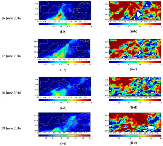Geographical distribution of MERRA-2 DOD (left column, (i)) and ISCCP-H cloud amount (right column, (ii)) during the day before (first row, (a)), the first (second row, (b)), second (third row, (c)), third (fourth row, (d)), and the day after (fifth row, (e)) the DAEC that took place during 16–18 June 2016 over the Mediterranean Basin. Results are given at 12:00 UTC of each day.