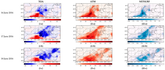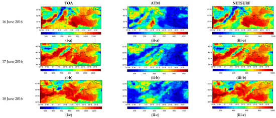 Geographical distribution of: the absorbed solar radiation (in W/m2) at the top of the atmosphere (left column, (i)), in the atmosphere (middle column, (ii)) and at the Earth’s surface (right column, (iii)) for the first (first row, (a)), second (second row, (b)), and third (third row, (c)) day (at 12:00 UTC) of the dust episode that took place during 16–18 June 2016 over the Mediterranean Basin.