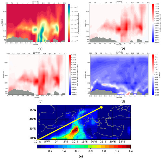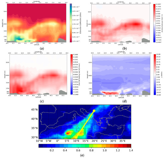 Vertical cross-sections of MERRA-2 dust extinction coefficients (in km−1, (a)), dust solar direct radiative effect in the atmosphere (in W/m2, (b)), dust solar radiative heating rates (in K/3 h, (c)), and atmospheric temperature gradients (in K/Km, (d)), along the slant path across the African dust export into the Mediterranean Basin (shown on the map of DOD, (e)), during the first day (16 June 2016) of the dust episode that took place during 16–18 June 2016 over the Mediterranean Basin.