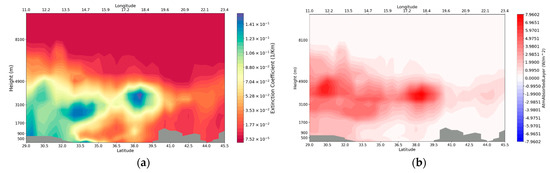 Finally, on the last day of the DAEC (18 June 2016), the selected slant path runs across the dust export axis, which slightly shifts eastward and covers the Ionian basin and the Aegean Sea (Figure 7e). The dust loadings remain high in this third day of the DAEC, with σext,dust values (yellowish and greenish colors) as large as 1.5 × 10−1 km−1 over the Libyan dust sources and off the Libyan coasts (from 29.5° N–11.5° E to 34.0° N–15.0° E), extending from the surface up to 5 km ASL. A distinct elevated dust layer between 3 and 5 km ASL (bluish colors in Figure 7a) is observed over the Ionian basin and Sea (from 34.0° N–15.0° E to 40.0° N–20.0° E), while a weaker (σext,dust up to 4.0 × 10−2 km−1) elevated dust layer is also observed at similar altitudes over the Balkans (bright orange colors in Figure 7a). Again, as in the previous two days, significant SW DDREs (up to 8 W/m2, Figure 7b) and heating rates (up to 0.07 K/3 h, Figure 7c) are observed near the dust layer, with the DDREs located a bit higher for the same reasons reported in the previous paragraph, i.e., available solar radiation and significant heating rates down to the surface. The dust-induced absorption of solar radiation, and the consequent radiative heating, decrease again the magnitude of lapse rates in the atmospheric layers overloaded by dust, contributing to the formation of intense temperature inversions (up to +13 K/km) observed below the elevated dust layer and over the colder sea surfaces extending from the Libyan coasts to the Ionian Sea (reddish colors in Figure 7d). Decreased temperature gradients are found along the rest of the slant path and below the elevated dust layer (light blue/white colors in Figure 7d).