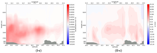 Vertical cross-sections of the buoyancy (vertical acceleration in m/s2, (left column (i)) caused by dust aerosols, and the corresponding prevailing vertical wind speeds (in m/s, right column (ii)) along the slant path across the African dust export into the Mediterranean Basin (shown in Figure 5e, Figure 6e, and Figure 7e) during first (16 June 2016, (a)), second (17 June 2016, (b)), and third (18 June 2016, (c)) days of the dust episode that took place during 16–18 June 2016 over the Mediterranean Basin. The results are given at 12:00 UTC of each day.