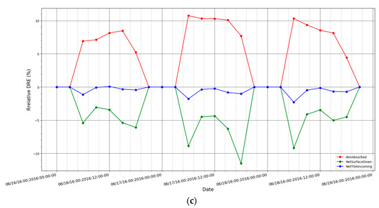 The dust radiative effects of the studied Mediterranean DAEC are also examined on a spatial mean basis. The spatial averaging is made over the part of the MB enclosed by the yellow frame (Figure 1), which includes the areas that are most affected by the dust export from the first (16 June 2016) until the last (third) day (18 June 2016) of the DAEC. The assessment of DDREs at a higher temporal resolution, specifically every 3 h, allows us to simultaneously follow the evolution of the regional mean DDREs at the TOA, in the atmosphere, and at the Earth’s surface (they all refer to the absorbed solar radiation at these levels), as shown in Figure 9b. The timeseries of 3-hourly DDREs demonstrate the significant role of the available solar radiation for DDREs, since all DDREs follow the daily cycle of incoming solar radiation at the TOA, maximized at noon (Figure 9a). Thus, as shown in Figure 9b, the maximum perturbations of solar radiation at the TOA (up to −8 W/m2 or 2%), in the atmosphere (up to +29 W/m2 or 11%), and at the Earth’s surface (down to −31 W/m2 or 12%) are observed at 12:00 UTC, when the available solar radiation is also maximum (1250 W/m2, Figure 9a). It should be noted that the corresponding regional mean DOD and SSA do not exhibit a considerable diurnal variation (Figure S9). In general, the maximum DDREs occur in the second day of the DAEC (17 June 2016), when the regional mean DOD is also maximum (0.26, Figure S13). Negative (down to −9 W/m2) DDREs are estimated at the TOA, which means that the exported African dust produces a planetary cooling effect of the region, except for 12:00 UTC on the first day, when the TOA DDRE takes a small positive value (+1 W/m2), indicating a slight planetary warning over the region. Although the DDREs in the atmosphere and at the Earth’s surface are maximum at noon, the TOA DDREs follow a different diurnal cycle with minimum values at noon and larger values in the early morning (06:00 UTC) or in the afternoon (15:00 UTC). The same diurnal variation was also found by [45] who used the WRF-Chem model to investigate the radiative impact of an extreme dust episode that took place in February 2015 over the central and eastern MB. However, the magnitude of DDREs found in [45] is greater (magnitudes up to 35 W/m2 in the atmosphere, 48 W/m2 at the surface, and 17 W/m2 at TOA) than in the present study, mainly due to the fact that estimations in the other study were made for clear-sky conditions, opposite to the real all-sky conditions (with cloud fractions up to 1) considered here. It is interesting that the estimated regional mean perturbation of the net surface solar radiation at 12:00 UTC associated with the examined African dust export (−31 W/m2 on 17 June 2016) largely exceeds the corresponding mean monthly total DRE (caused by all aerosol types) being equal to −21 W/m2 in June [55]. As shown in Figure 9c, dust aerosols significantly perturb the regional solar radiation budget, by up to 12% at the surface, 11% in the atmosphere, and 2% at the TOA.