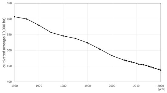 In recent years, Japan’s agricultural industry has faced a number of challenges, including a decline in production due to a decrease in farmland area, a shortage of labor due to a decrease in the number of producers, and an aging population []. In 2015, 64.9% of agricultural workers were aged 65 years old or above; however, by 2020, this percentage had increased to 69.8%. In addition, the arable land area in Japan has been decreasing, as shown in Figure 1. The total area of arable land as of July 2020 was approximately 4.37 million hectares. Therefore, in recent years, smart agriculture using robots and IoT has been studied. Smart agriculture aims to solve the shortage of human labor by automating tasks that are normally performed by humans. It also aims to improve the efficiency of work by using computers to manage and analyze data on crops and the environment, thereby increasing production per unit area and improving quality.