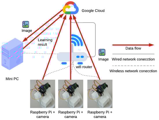 The network architecture and data flow of the system are shown in Figure 2. First, each camera device is placed in the field. It takes an image of the area to be photographed and uploads the image to Google Drive. The PC downloads the images uploaded to Google Drive, performs image analysis, and outputs the measurement data. Finally, the measurement data are uploaded in CSV format to a specific shared folder on Google Drive, and the irrigation system can access the measurement data.