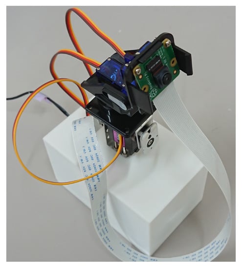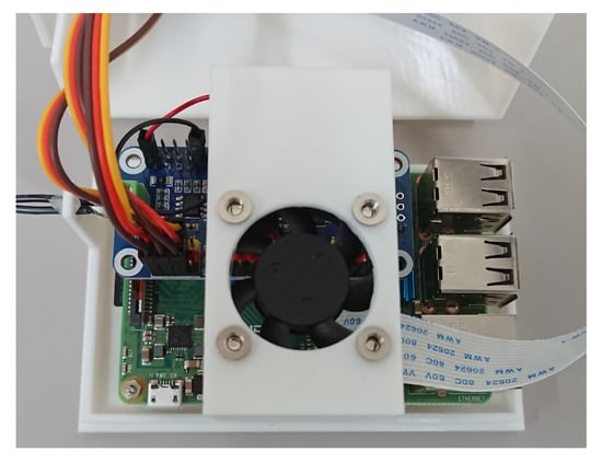 The exterior and interior of the camera device are shown in Figure 3 and Figure 4, respectively. The device is a small camera with a Raspberry Pi, a 3-axis pan-tilt camera mount, and can move the viewpoint. The Raspberry Pi, pulse-width modulation (PWM) servo driver board, and other components are housed in a 3D-printed case, and a 3-axis pan-tilt camera mount is attached to the top of the case. In order to prevent the Raspberry Pi from overheating during field use, it is necessary to use a case with a cooling fan to cover the Raspberry Pi. There were no cases with cooling fans on the market, so we used a 3D printer to make our own case, which consists of two parts: a base to hold the Raspberry Pi and a lid to cover it. The specifications of the camera device used are shown in Table 1.