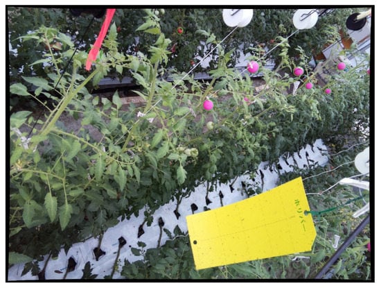 From Equation (3), we calculate distances and from the camera using the reference balls corresponding to ‘target stem’ and ‘seichouten’. Finally, we calculate the distance between the growing point and stem at the base of the flower cluster, mm, using the cosine theorem and Equation (4).