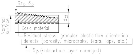 An important part of process planning refers to establishing the machining parameters. The depth of cut is the parameter that directly influences the machined-surface quality because it interacts with both the surface and subsurface layers of the processed material. The machined-surface quality must not be appreciated only by the surface roughness. A correct assessment must consider the condition and characteristics of the surface, as well as of the subsurface of the processed material. Thus, surface integrity becomes a very important criterion for assessing the quality of the machined surface [1,2]. Surface integrity refers to certain aspects of the surface, such as form, roughness, waviness, lay, and subsurface characteristics such as residual stress, granular plastic flow orientation, and defects (porosity, micro cracks, tears, laps, etc.) [3]. Surface integrity is influenced by various factors, including the machining parameters [4,5,6]. Dumas et al. [7] approach the connection between the rough and finishing tool passes considering the final surface integrity. The final surface integrity is influenced by the previous operations/passes. Surface integrity is specific to each operation. Thus, the concept of Current-Previous Machining Process—CPMP [8] becomes very important. This concept considers that surface roughness Rzp and the components of Sp generated during the machining process and caused by the casting process must be considered when calculating dcf (current depth of cut), following Figure 1. Rzp refers to the surface roughness obtained after the previous operation. Sp refers to the subsurface layer degraded after the previous operation (subsurface defects). The depth of cut must also contain dimensional tolerance obtained at the previous operation (δp), flatness deviation obtained after the previous operation (εFp), and axial clamping error related to the current operation (εCaxc). Among the first researchers who have considered the connection between the depth of cut and machined-surface quality was Kovan [9,10], whose ideas were overtaken by Picos [11], as well. However, at that time, the term surface integrity was not known. This term was first used by M. Field, J. F. Kahles in 1964. In accordance with these papers, the components of dcf are colinear vectors, as Formula (1) illustrates.
