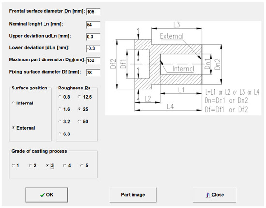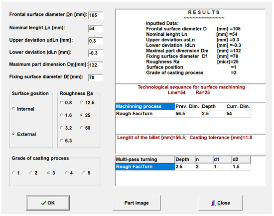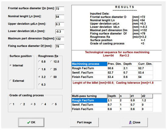 Description of the module CDFTCI: After data input, the determination of the technological sequences for machining the considered front face follows. The decision variable is the roughness Ra. Then, for each technological sequence, calculated are the depths of cut (dcf), previous dimensions (Lpre), standardized dimensions (Lpren), and the real depths of cut (dcfreal). The results are stored in Table t(3,3). The coordinating parameter is surface integrity. After calculating a technological sequence, L1 and tft are updated, and the next technological sequence is calculated (if applicable). After closing the cycle controlled by counter p, the billet dimension (Lcib) and the related tolerance (δLcib) are determined. The results are summarized as sequences of multi-pass-facing turning (Table t1(3,4)). The user interface is presented in Figure 3. Description of user–computer interface: The user interface contains four areas. The first area is for data entering (left side) and contains fields for numerical data, buttons for choosing the surface position, the roughness, and the casting process grade. The next area, on the right side, presents a passive image of the part, used as an aid for specifying the mode in which the surface position is established (internal/external), as well as for Dn and Ln. The third area contains three buttons: OK, Part Image, and Close. The Part Image button is for re-displaying the passive image as many times as required. After data validation, the fourth area automatically appears instead of the second area and contains the obtained results.